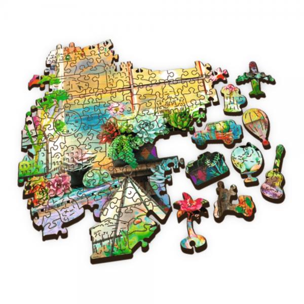 De serie houten puzzels van 500+1 stukjes is perfect voor alle puzzelliefhebbers. Het heeft een afbeelding van 37,5 x 25,4 cm van het interieur van een strandhuisje. De puzzel is gemaakt van hout en de verpakking is volledig milieuvriendelijk van karton. De puzzel bevat onregelmatig gevormde stukjes en 50 figuurtjes met reisthema.