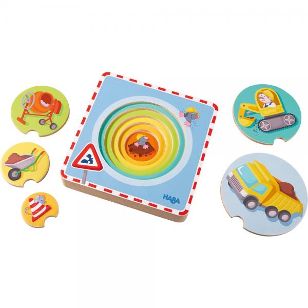 Stoere, houten 3D-puzzel bestaande uit 5 puzzelstukken en 6 puzzellagen in het thema van de bouwplaats.