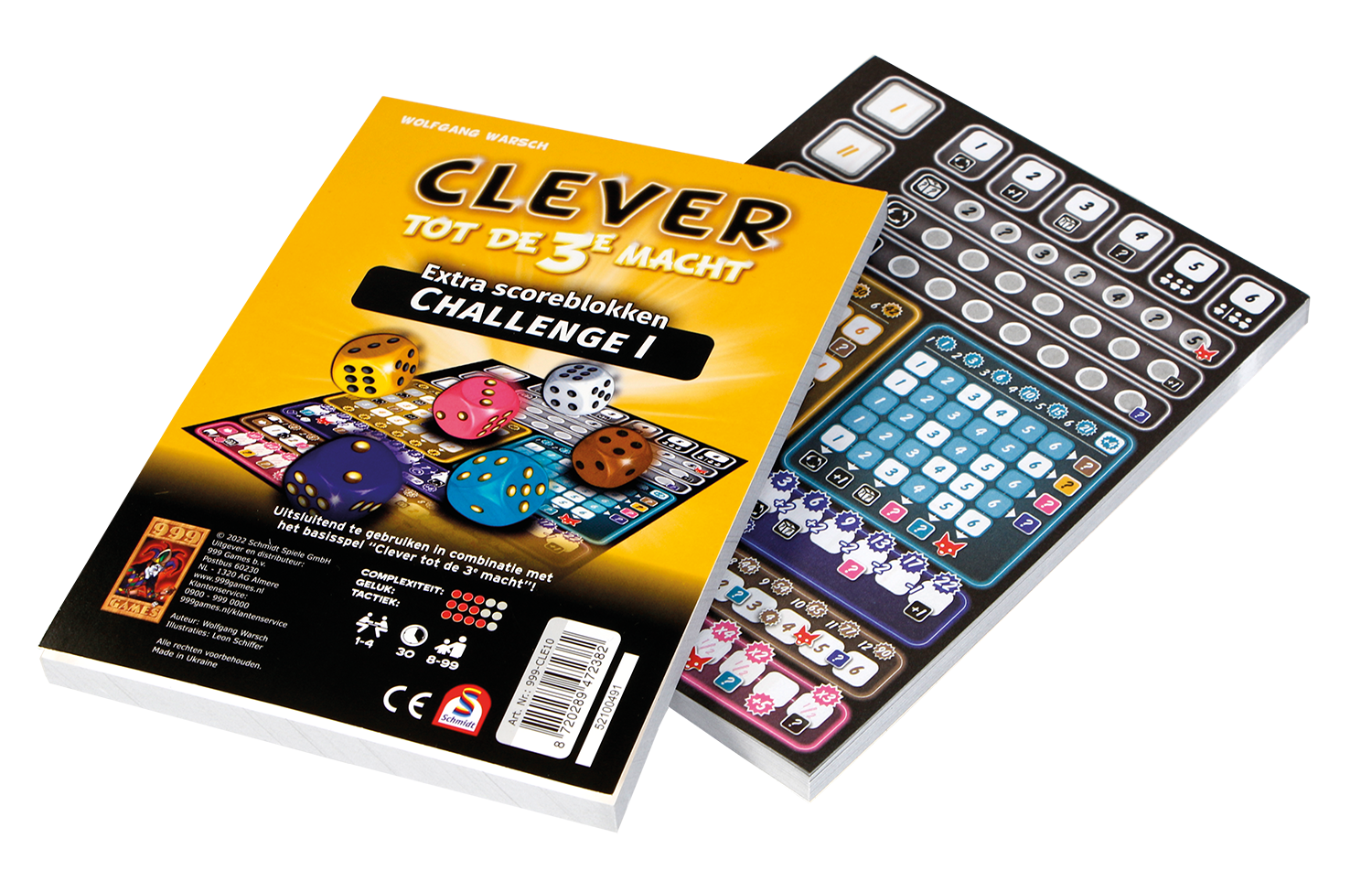 Voor doorgewinterde Clever-spelers en andere mensen op zoek naar een uitdaging is er nu Clever tot de 3e Macht: Challenge 1! Deze extra scoreblokken voor Clever tot de 3e Macht verschillen van de vellen van het originele spel. De spelregels zijn verder hetzelfde, maar moeten nu worden gebruikt op een scorevel dat net wat anders werkt. Zo is de lay-out van de gele en de blauwgroene categorie compleet veranderd en moet je bij de blauwe categorie nu rekening houden met door elkaar lopende plus- en mintekens.