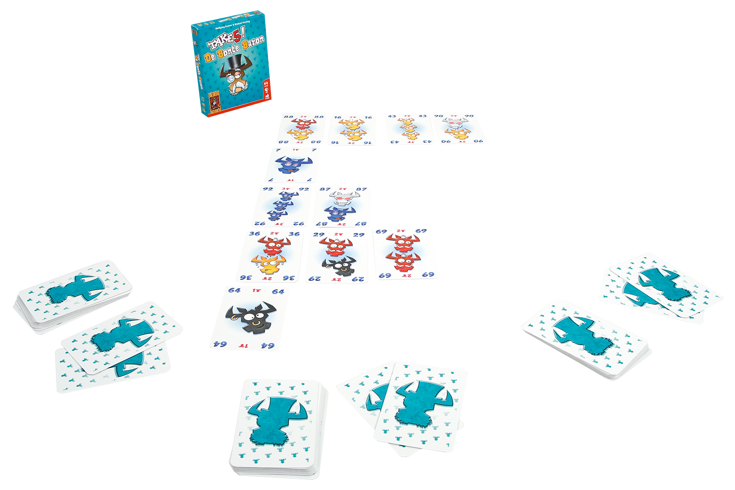 Speel kaarten met koeienkoppen uit je hand om rijen te vormen. Leg ze wel handig aan, want als jouw rij teveel koppen van dezelfde kleur bevat moet je de hele rij kaarten pakken. Aan het einde van de ronde is elke kaart minpunten waard. Worden de rijen langer en de keuzes lastiger, schakel dan de hulp van de Bonte Baron in; deze past overal! Zes is teveel in zowel kleur als aantal in deze bonte variant van Take 5!