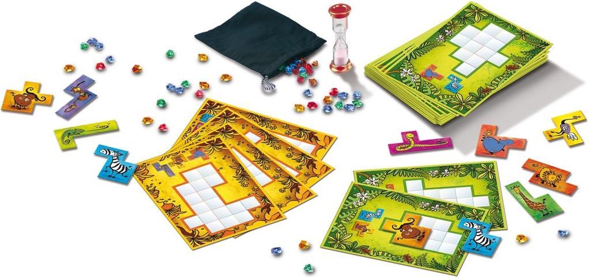 Ubongo Junior is de kinderversie van het razendsnelle puzzelspel dat wereldwijd miljoenen fans heeft. In dit kleurrijke spel proberen 1 tot 4 spelers tegelijkertijd om dierentegels passend op hun puzzelbord te leggen. De snelste speler roept "Ubongo!" en trekt als beloning edelstenen uit de buidel. Maar geen paniek: zolang de zandloper loopt, kunnen de andere spelers nog steeds hun puzzel oplossen en edelstenen verzamelen.