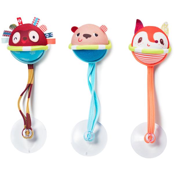 3 badballetjes van neopreen worden met zuignapjes bevestigd in het bad en dansen op het water, vlak voor baby.