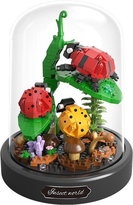 De 16381 Balody lieveheersbeestjes is een grappige miniblock bouwset voor kinderen vanaf 6 jaar en volwassenen. Onder een chique stolp op een zwarte schotel, bouwt de modelbouwer een groene plant met twee rode lieveheersbeestjes en een gele. Behalve deze vrolijke kleuren, zijn er bescheiden paddenstoelen en kleurige bloemetjes, wat zorgt voor een speels, gedetailleerd en levendig tafereel vol charme en natuurpracht.