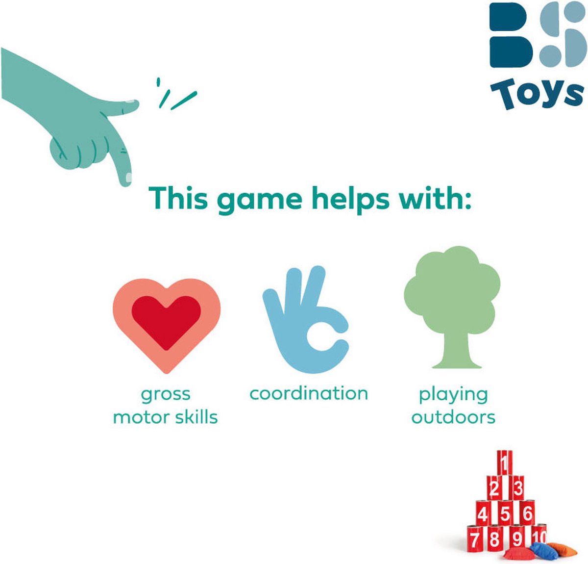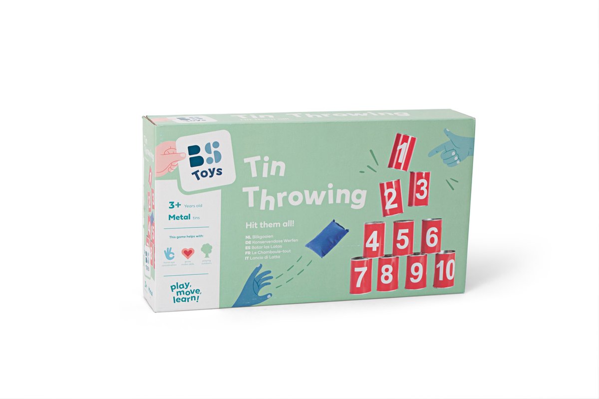Probeer met de bijgeleverde pittenzakken alle 10 metalen blikken omver te werpen. Of speel in teams en tel wie de meeste punten scoort. Wie gooit het hele bouwwerk in één keer om?