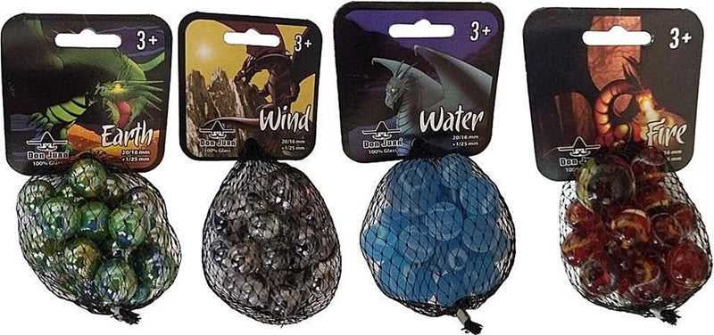 De set "Knikkers Elementen Draken" bevat 20 knikkers van 16mm en één knikker van 25mm in verschillende kleuren en designs met drakenthema, uitgegeven door Don Juan. Keuze uit een van 4 varianten.