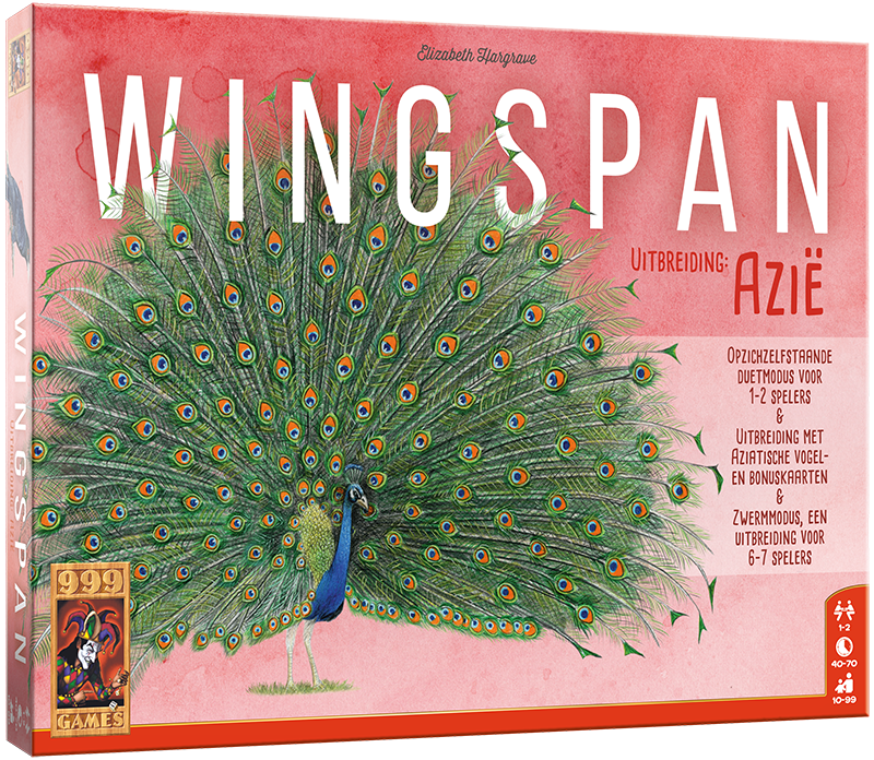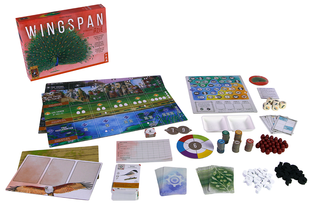 Informatie van de uitgever:In dit nieuwe deel van Wingspan gaan we op zoek naar nieuwe vogels op het Aziatische continent. 90 nieuwe vogelsoorten maken hun opwachting, samen met nieuwe bonuskaarten en andere extra’s. Zet vogels in je persoonlijke natuurgebieden uit en scoor punten door ze zo goed mogelijk te laten samenwerken. Deze versie van Wingspan kan met twee spelers worden gespeeld. Het spel bevat regels voor de nieuwe “duet”-variant. In deze variant scoor je extra punten met behulp van een tableau met vogeleigenschappen. Zodra je een vogel speelt, dek je de bijhorende eigenschap op het tableau af voor bonuspunten. Dit zorgt voor een uitdagend spel voor twee, vol tactische keuzes. Maar Wingspan: Azië kan ook als uitbreiding op het basisspel worden gespeeld. Sterker nog, met het extra speelmateriaal kan een extra groot spel met maar liefst 7 spelers worden gespeeld! Hierbij wordt gebruik gemaakt van de “zwerm”-variant. In deze spelvariant zijn voortdurend twee spelers tegelijkertijd aan de beurt en wordt de spelersgroep in tweeën verdeeld. Elke groep heeft een eigen vogelhuisje en een eigen kaartenvoorraad, maar beide groepen spelen wel gezamenlijk met dezelfde doeltegels. Dus of je nu een nieuwe ervaring voor twee spelers wilt proberen of er juist een groot vogelfeest voor met zijn zevenen van wilt maken, voor Wingspan-fans is deze uitbreiding een must!