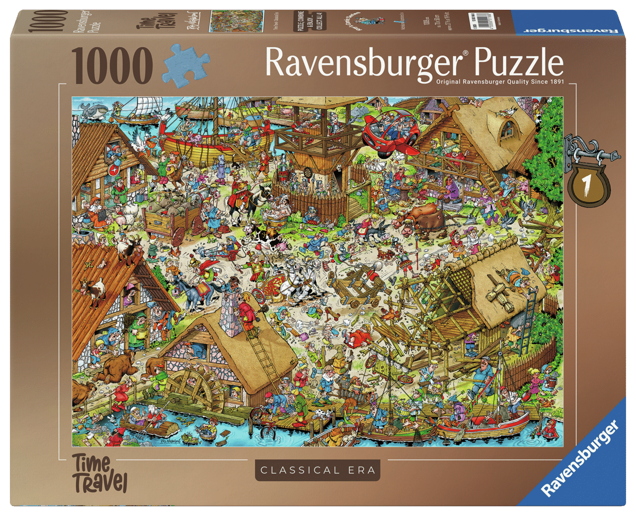 Reis door de tijd met Time Travel 1 – Classical Era, het eerste deel van Ravensburgers exclusieve Ray's Comic Series Time Travel puzzelreeks! Deze kleurrijke en gedetailleerde 1000-stukjes puzzel neemt je mee naar de klassieke oudheid, een tijdperk van filosofen, keizers en legendarische bouwwerken.