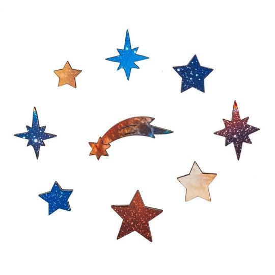 Twinkelende sterren schijnen hun licht om zich heen. De lange staarten van kometen laten heldere sporen achter. De puzzelstukjes zijn verrassend gevormd als planeten en zonnewinden. De heldere stralen van de zon verlichten een echt ruimteavontuur.