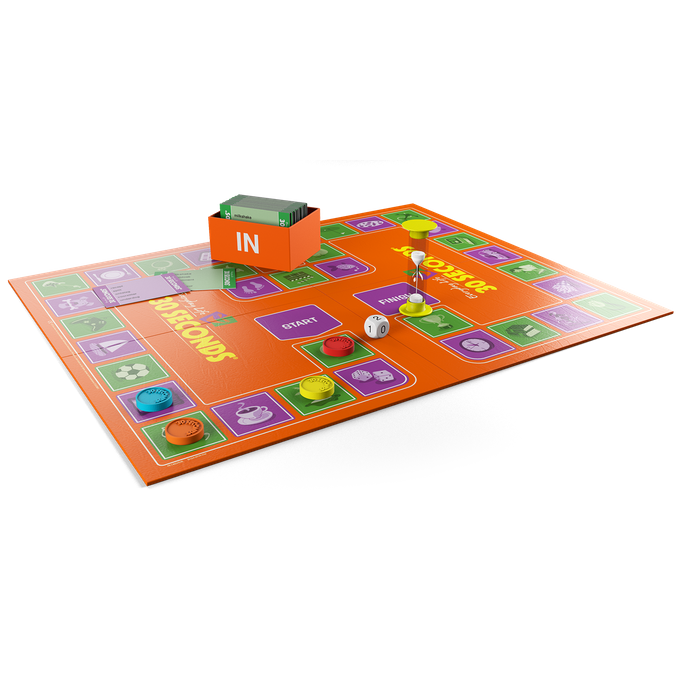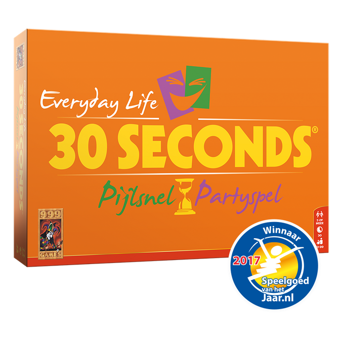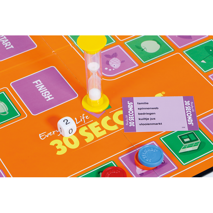 Spectaculair partyspel voor teams met alledaagse begrippen. Fantastisch op feestjes en partijen. De spelers vormen teams. Een van jullie probeert binnen 30 seconden zoveel mogelijk van de 5 begrippen op een kaartje te omschrijven. Hoe meer begrippen je teamgenoten raden, des te meer velden jouw team op het speelbord vooruit mag. Een dobbelsteenworp kan daar nog verandering in brengen. Bereikt jouw team als eerste de finish? Deze speciale editie bevat begrippen die in het alledaagse leven voorbijkomen. Daardoor is 30 Seconds Everyday Life ook geschikt voor jongere kinderen!