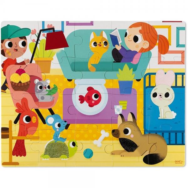 20-delige reuzenpuzzel in hard karton, met 7 onderdelen met textuur (bont voor de hond, het konijn, imitatieschildpad voor schildpad, glittereffect voor de papegaai, textuureffect voor de plant en de lamp, fleece-effect voor de wollen ballen). Illustratie met heldere kleuren en huisdieren als thema. Poster inbegrepen. Verpakking: geschenkdoos met textuur op het deksel. Geschikt voor kinderen van 2-4 jaar.