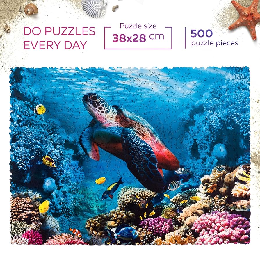 Makkelijk te kopen. Onmogelijk om te verlaten! Recht naar de diepte van de zee! Kom dichter bij de zee met het Shimmering Turtle legpuzzel. Het koraalrif, de heldere vissen en de zeeschildpad wachten op je in deze houten puzzel.