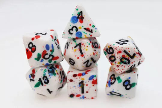 De Paint Splatter RPG Dice Set barst van kleur met een speelse mix van levendige tinten die het gevoel van een artistiek avontuur oproepen. Ideaal voor spelers die creatieve, expressieve of onvoorspelbare karakters spelen. De cijfers contrasteren goed en zijn daardoor uitstekend leesbaar tijdens het spel. Deze complete set bevat alle dobbelstenen die je nodig hebt voor je RPG-sessies (D4, D6, D8, D10, D%, D12 en D20).