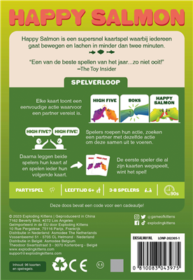 Ben je klaar voor chaos, gelach en heel veel beweging? Dan is Happy Salmon het perfecte partyspel voor jou. In slechts een paar seconden uitgelegd, en voor uren speelplezier. Zoek spelers met dezelfde actiekaart, voer die samen uit (zoals een high five of Happy Salmon-beweging), gooi je kaart af en ga door!