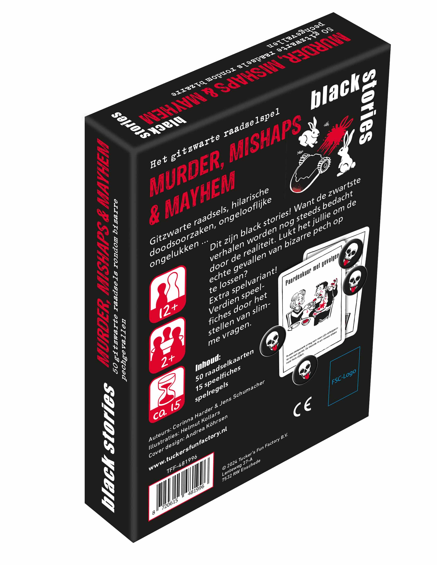 Gitzwarte raadsels, hilarische doodsoorzaken, ongelooflijke ongelukken? Dit zijn black stories! Want de zwartste verhalen worden nog steeds bedacht door de realiteit. Lukt het jullie om de echte gevallen van bizarre pech op te lossen? Extra spelvariant! Verdien speelfiches door het stellen van slimme vragen.