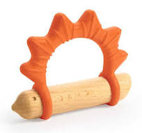Een bijtring in de vorm van een egel, gemaakt van zacht silicone met een behuizing van natuurlijk hout.
