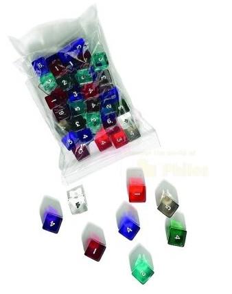 Dobbelstenen 6 zijdig 15 mm. Transparant Acryl 6 kleuren assorti. Met cijfers, in plaats van punten. Per 12 stuks in plastic zakje. HOT Games