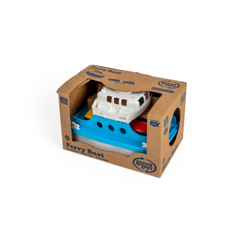 Gebruik de uitschuifbare oprit om de onderste laadruimte te vullen met maximaal vier Green Toys Mini Vehicles of Fastbacks. Als realistisch water speelgoed heeft het open bovendek twee kleine bankjes aan elke kant, evenals elf ramen die uitkijken op het hoofdniveau.