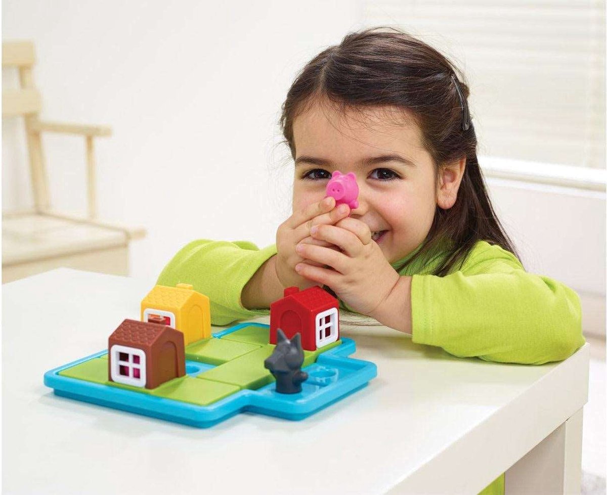 Dit puzzelspel van SmartGames is ideaal voor de handjes van jonge kinderen, met 3 grote, stevige puzzelstukken die gemakkelijk vast te houden zijn. Ontdek hoe de biggetjes in hun huis passen en door het raam naar buiten kijken.