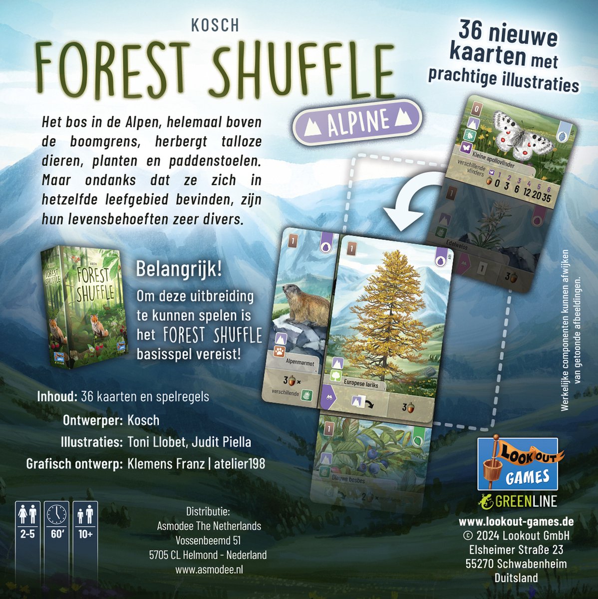 Met Forest Shuffle: Alpine breid je het basisspel uit naar de ruige natuur van de Alpen. Maak kennis met nieuwe dier- en plantensoorten die zich aan de extreme omstandigheden van het hooggebergte hebben aangepast.
