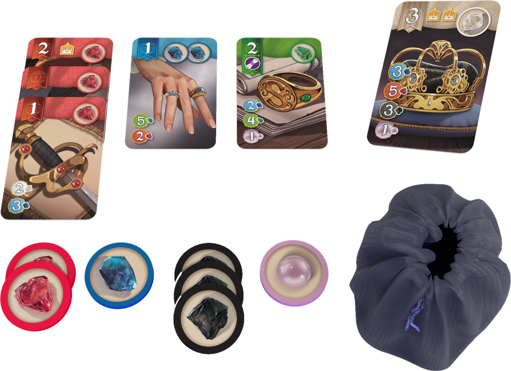 Inhoud: 1 overwinningstegel, 67 juweelkaarten, 1 zak, 3 privilege-rollen, 20 edelsteenfiches, 2 parelfiches, 3 goudfiches, 1 spelbord, 4 kroonkaarten en een spelhandleiding.
