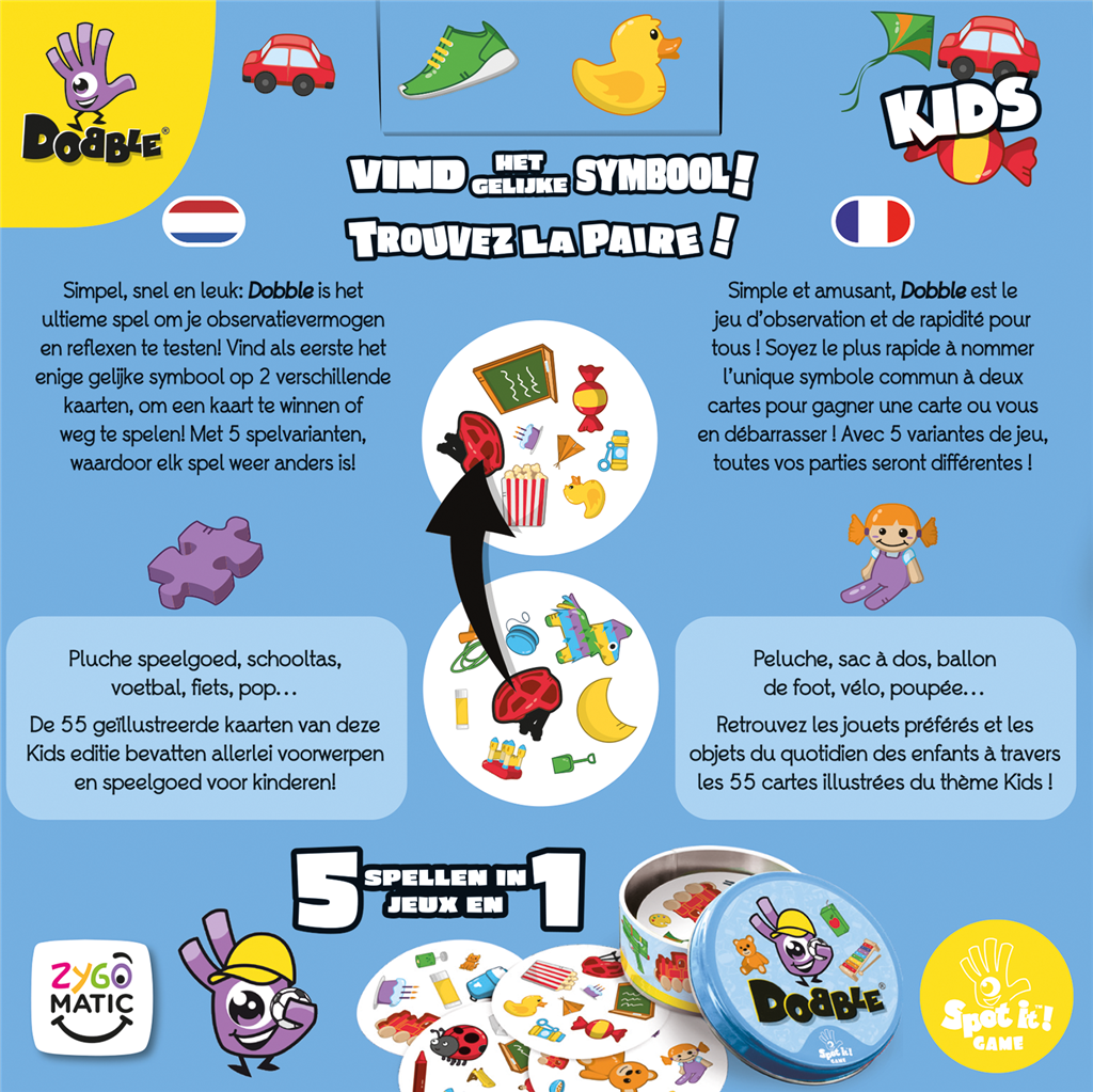 Voor wie niet kan wachten om Dobble te spelen, maar nog net iets te jong is bevat Dobble Kids kaarten die voor 6 kindvriendelijke spellen gebruikt kunnen worden.