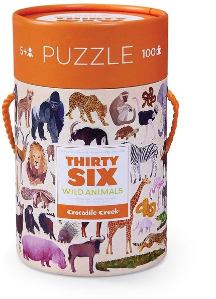 Puzzel van 100 stukjes met afbeelding van 36 dierensoorten.