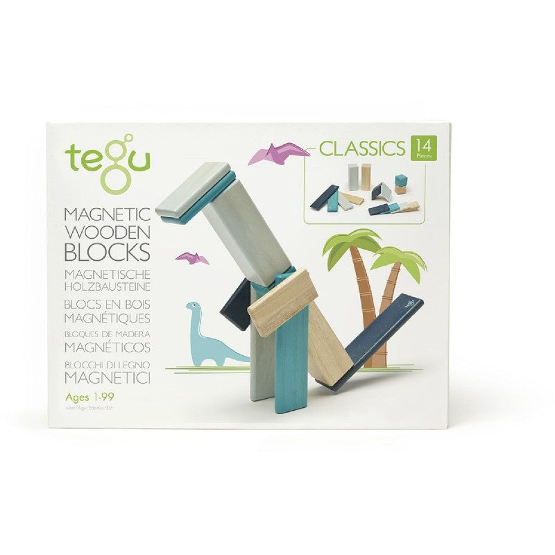 14-delige starterset met blauwe en houtkleurige blokken in vijf verschillende vormen.