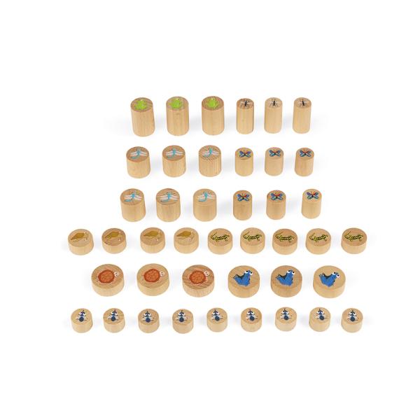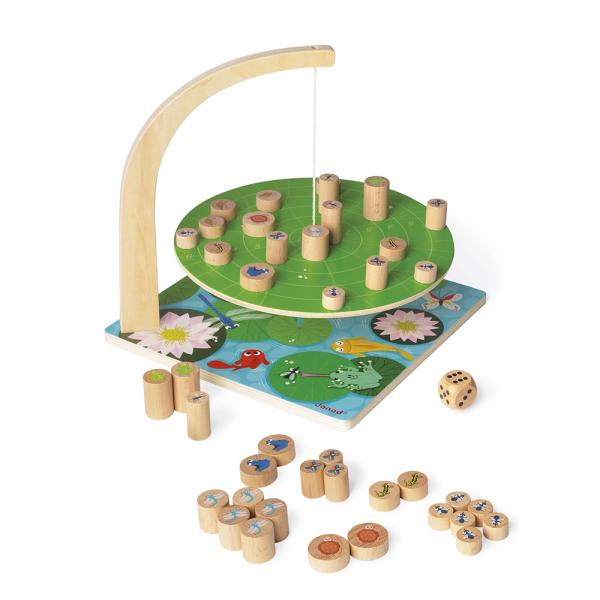Elke speler kiest een dier/ insect en plaatst ze op de waterlelie zonder deze te laten kantelen! Opgelet, het spel is verloren als alle pionnen op de grond vallen!!! Men moet handig en tactisch zijn om in de vijver te overleven! Dit spel ontwikkelt behendigheid en concentratie! Een houten bord met een waterlelie erboven en 42 pionnen in verschillende groottes. 2 tot 6 spelers. Geschikt voor kinderen vanaf 6 jaar.