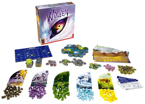 Ruig terrein, weinig mensen, veel wild. Een ideale omgeving voor wolven. Deze roedeldieren zoeken elkaar op om op prooi te jagen en zich voort te planten. Maar niet alle roedels gaan vreedzaam met elkaar om. Ze willen allemaal de macht over het gebied en daar hebben ze alles voor over. Wolven is een strategisch spel, waarin je een eigen roedel wolven leidt. Je probeert gebieden te claimen, je roedel uit te breiden, de eigenschappen van je roedel te ontwikkelen, holen te bouwen en op prooi te jagen. Al die dingen leveren op verschillende manieren voordelen en overwinningspunten op. Je beurten worden gestuurd door dubbelzijdige terreintegels. Elke beurt draai je er afhankelijk van de gekozen actie een aantal om. Je mag dan een actie op een veld van dat terrein uitvoeren, mits het binnen bereik van je wolven ligt. Zo kun je je wolven verplaatsen, schuilplaatsen bouwen, waardoor je de eigenschappen van je roedel verbetert, of je schuilplaatsen naar holen opwaarderen. Sommige acties kun je echter uitsluitend met je alfawolven uitvoeren en daar heb je er helaas niet zo veel van. De meeste punten scoor je door bepaalde gebieden te controleren op het moment dat de maan een bepaalde stand bereikt. Je hebt daarvoor de meeste speelstukken in zo’n gebied nodig. Omdat er per veld maar 2 speelstukken mogen staan, ontstaat er hevige concurrentie tussen de verschillende roedels van de spelers. Wolven is een zeer thematisch en uitdagend bordspel. De interactie tussen de roedels en het variabele speelveld zorgen er keer op keer voor dat je nieuwe strategieën en mogelijkheden moet verkennen om de winst naar je toe te trekken. Het prachtige artwork en de houten wolfjes zorgen voor een intense spelbeleving.