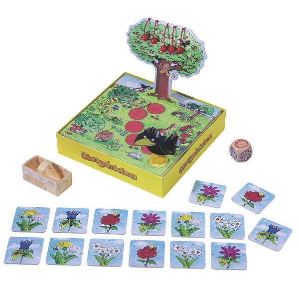 De kinderen helpen Petra Perenboom bij het plukken van de kersen. Maar daar komt ook al de stoute raaf de tuin binnen om de lekkere kersen te pikken ... Zijn jullie vlug genoeg om alle kersen te plukken voordat de raaf bij de boom is? Een coöperatief geheugenspel met kleurendobbelsteen en driedimensionale kersenboom.