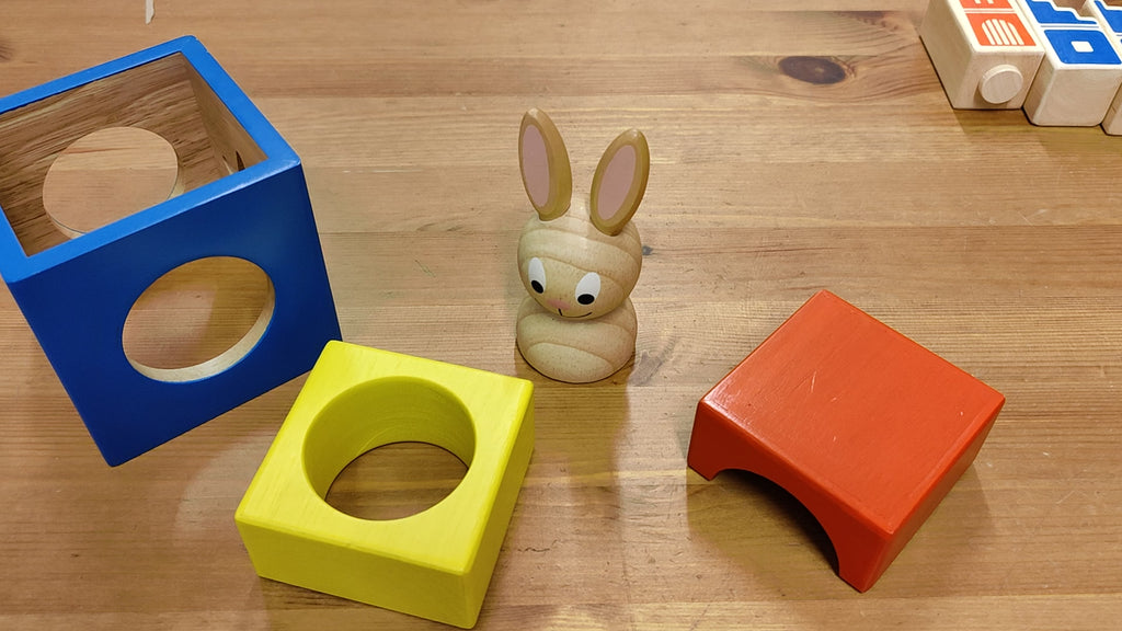 Zit het konijn op de gele, de rode of de blauwe blok?