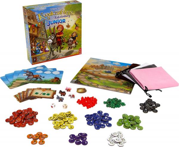 Kakelenburg is beroemd wegens de kwakzalvermarkt. Maar wist je dat op de dag voor de markt eerst een grote race wordt gehouden? Met jouw rijdier neem je het tegen de andere spelers op om zo snel mogelijk de finish te halen! Je moet daarvoor naar voer grabbelen. De dieren zijn gek op suikerbieten en kunnen hierdoor sneller lopen. Maar geef je ze droomkruid, dan worden ze slaperig en traag. Net als bij het originele Kwakzalvers van Kakelenburg moet je bij deze juniorvariant grabbelen naar de beste ingrediënten. Op bepaalde punten in het spel kun je extra voerfiches kopen, die je aan je grabbelzak toevoegt. Elk fiche heeft een eigen effect, wat tijdens de race allerlei verrassingen geeft. Kwakzalvers van Kakelenburg Junior is een toegankelijke, gestroomlijnde versie van het originele Kwakzalvers en daarmee ideaal voor het hele gezin. Het spel bevat verschillende niveaus, zowel voor beginners als gevorderden. Speel met jonge spelers de makkelijke rupsvariant en met ervaren spelers de meer uitdagende vlindervariant. Wie wint de race naar Kakelenburg?