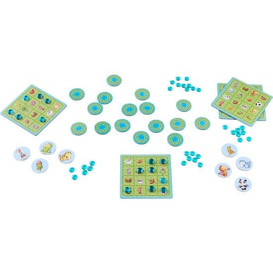 Samen met draak Flonkervuur en zijn vrienden gaan de spelers op ontdekkingstocht om bij het omdraaien van de bingokaartjes vuurspuwende vulkanen, geheimzinnige schatkaarten en nog veel meer te ontdekken. Voor elk plaatje dat ze op hun grote bingokaart vinden, krijgen ze een dondersteen. Wie als eerste er vier op een rij heeft, roept ?Drakenbingo!? en wint. Inhoud: 4 bingokaarten, 24 kaartjes, 45 donderstenen, 1 handleiding. Korte instructies:? Kaartjes mengen en verdekt neerleggen.?Per speler een bingokaart, donderstenen bij de hand houden.?Om de beurt kloksgewijs spelen. Een kaartje omdraaien.?Getoonde afbeelding op eigen bingokaart gevonden: dondersteen erop leggen.?Wie als eerste vier donderstenen op een rij heeft, wint het spel.