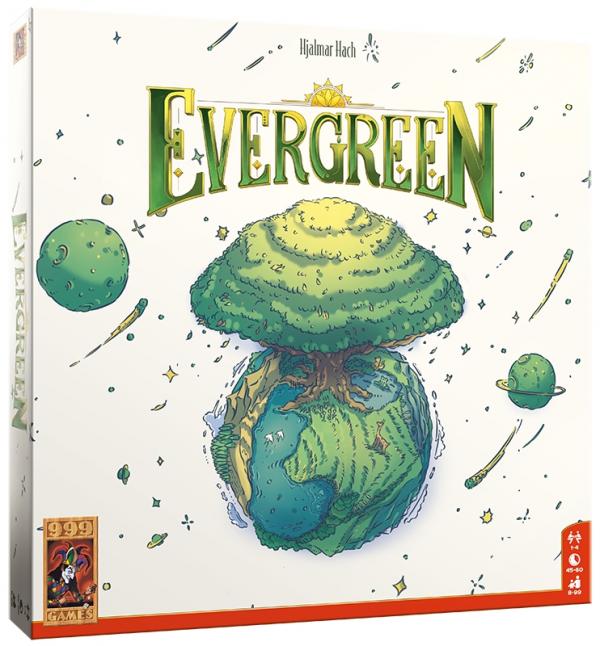 Bouw een eigen driedimensionaal ecosysteem De spelers hebben een nieuwe planeet ontdekt en proberen die nu leefbaar te maken. Iedere speler heeft een eigen tableau, waarop hij kleine en grote bomen, struiken en meren zet. In zijn beurt kiest hij een kaart uit een aanbod en mag hij in het op de kaart aangegeven gebied 2 acties uitvoeren of 1 actie in een ander gebied naar keuze. Daarbij kan hij uit een combinatie van bomen planten en opwaarderen kiezen. Bonusacties geven extra mogelijkheden, zoals het planten van struiken, die je bossen vergroten, en het aanleggen van meren, die extra opwaarderingen mogelijk maken. Elke ronde krijg je 1 beurt minder, maar omdat je bonusacties steeds sterker worden, doe je per beurt meer. Na elke ronde krijg je punten voor bossen en bomen die zonlicht opvangen. Evergreen is een tactisch spel, dat door de eenvoudige spelregels zowel voor gevorderde als beginnende spelers geschikt is. Het driedimensionale effect van de speelstukken zorgt ervoor dat het er niet alleen overzichtelijk, maar ook prachtig uitziet. Wie bouwt het meest effectieve ecosysteem?