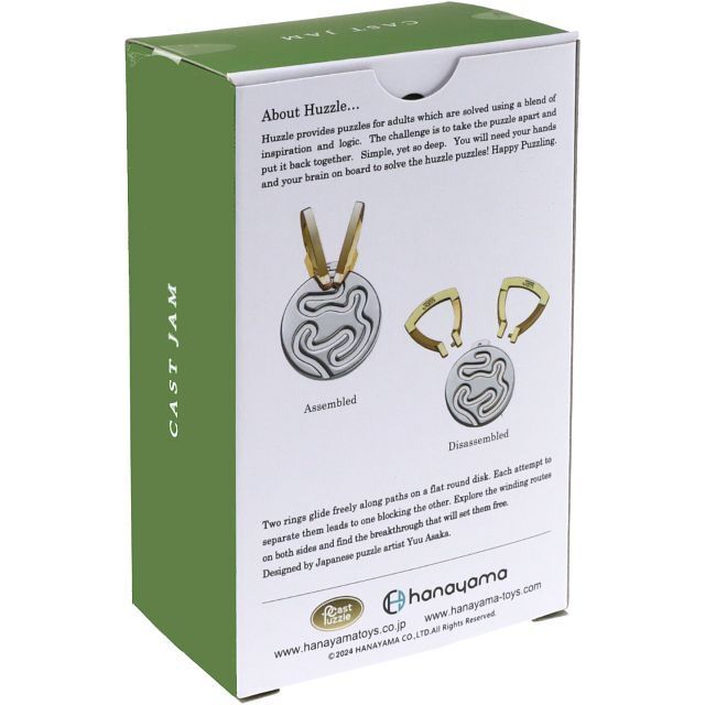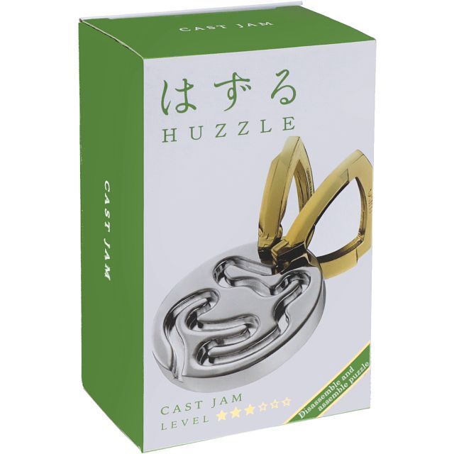 Huzzle Cast Jam is een stijlvolle metalen breinbreker van het gerenommeerde merk Huzzle (voorheen Cast Puzzle). Deze puzzel, ontworpen door de Japanse meesterpuzzelmaker Yuu Asaka, lijkt eenvoudig – twee ringen bewegen soepel over een ronde schijf met groeven – maar schijn bedriegt!