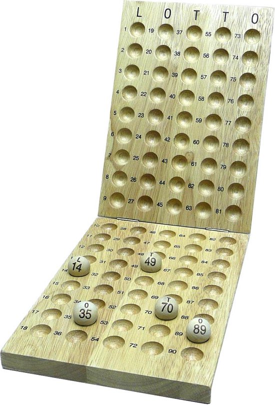 Houten Lotto-Kien Controle bord, gemaakt van rubberboomhout. Voor 90 ballen van 25 mm. diameter Maat 59 x 19.5 x 1.7 cm open. Maat opgeklapt 29 x 19.5 x 3.5 cm. Vervangingsbord voor molen nr.770568.