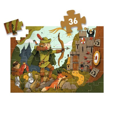 Robin gaat op avontuur om het geld van de sheriff van Nottingham te stelen en aan de allerarmsten te geven. Deze kleurrijke puzzel van 36 stukjes wordt geleverd in een mooie silhouetdoos.